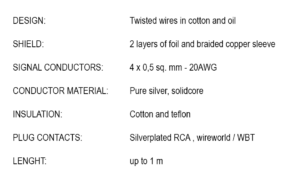 Der er brugt 99,999% rent sølv til en lederen i coax kablet, som ligger i en kappe af bomuld og olie. Olien er med til at give en perfekt dielektrisk konstant, der gør at meget ”fnidder” forsvinder og kablet bare opleves meget mere musikalsk.